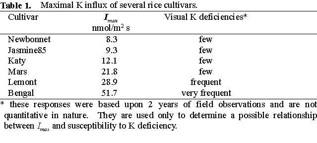 have shown that rice plants differ in the maximum rates of K uptake. However,